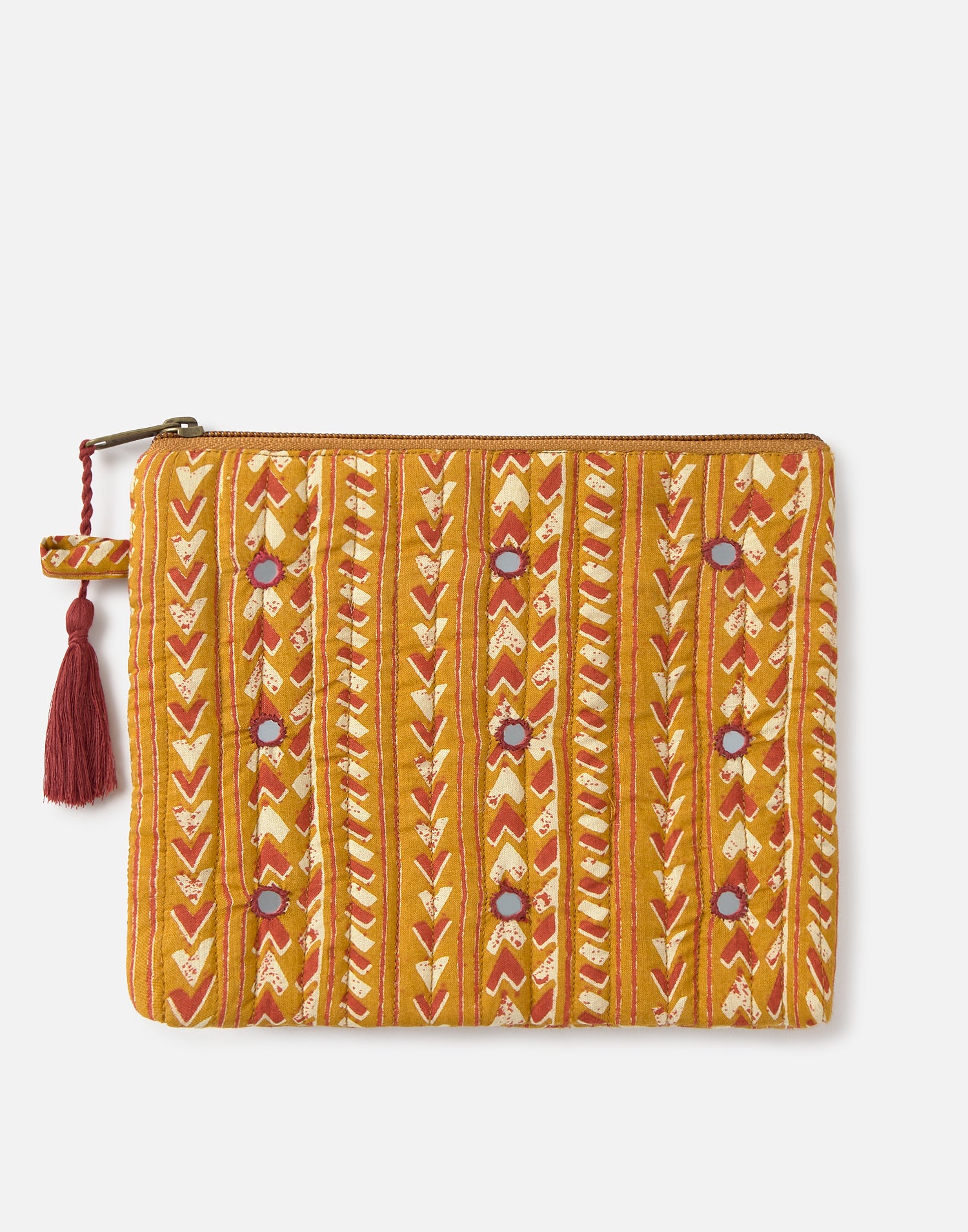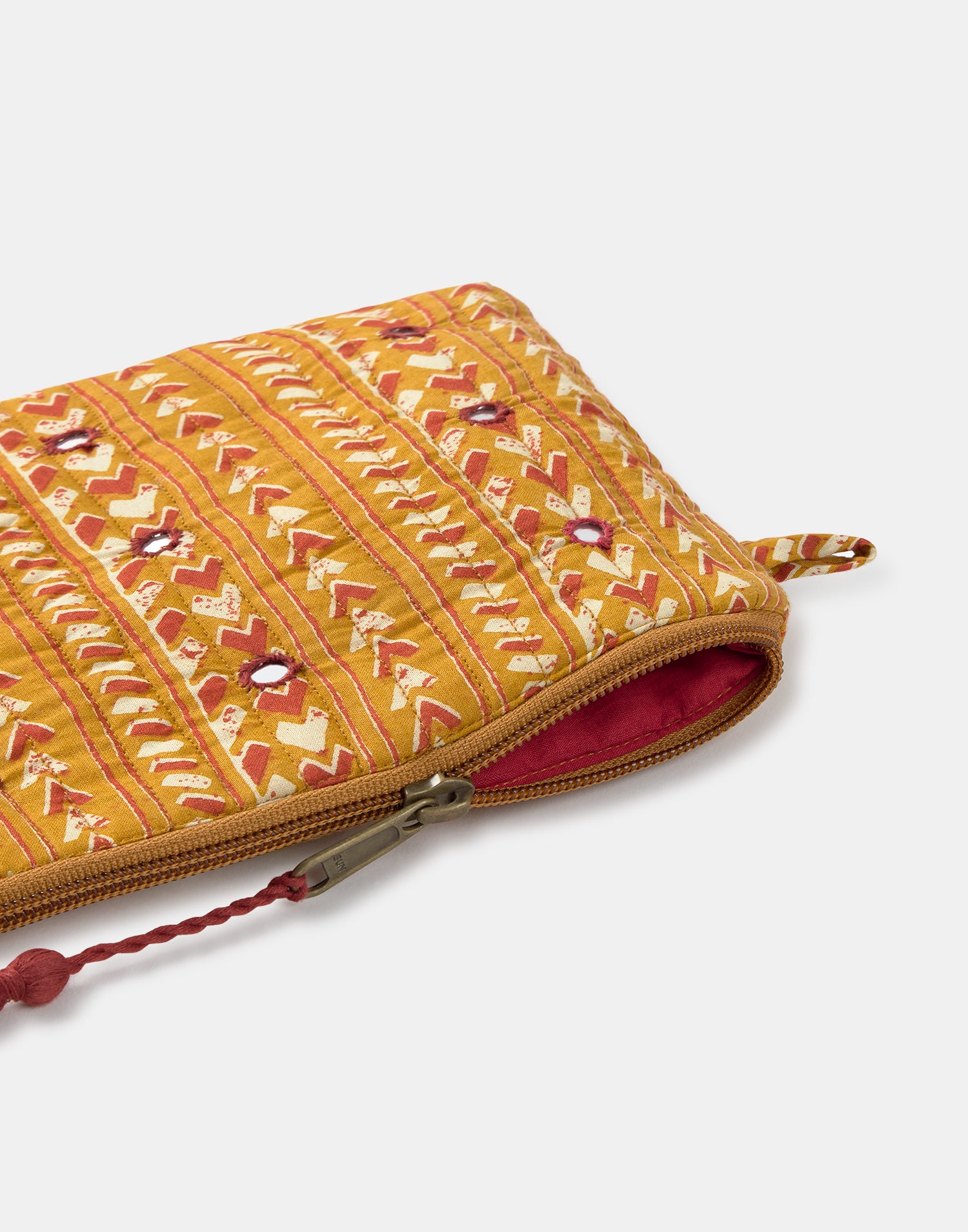 Estuche confeccionado en algodón con detalle de espejos bordados y cierre de cremallera con pompón.
