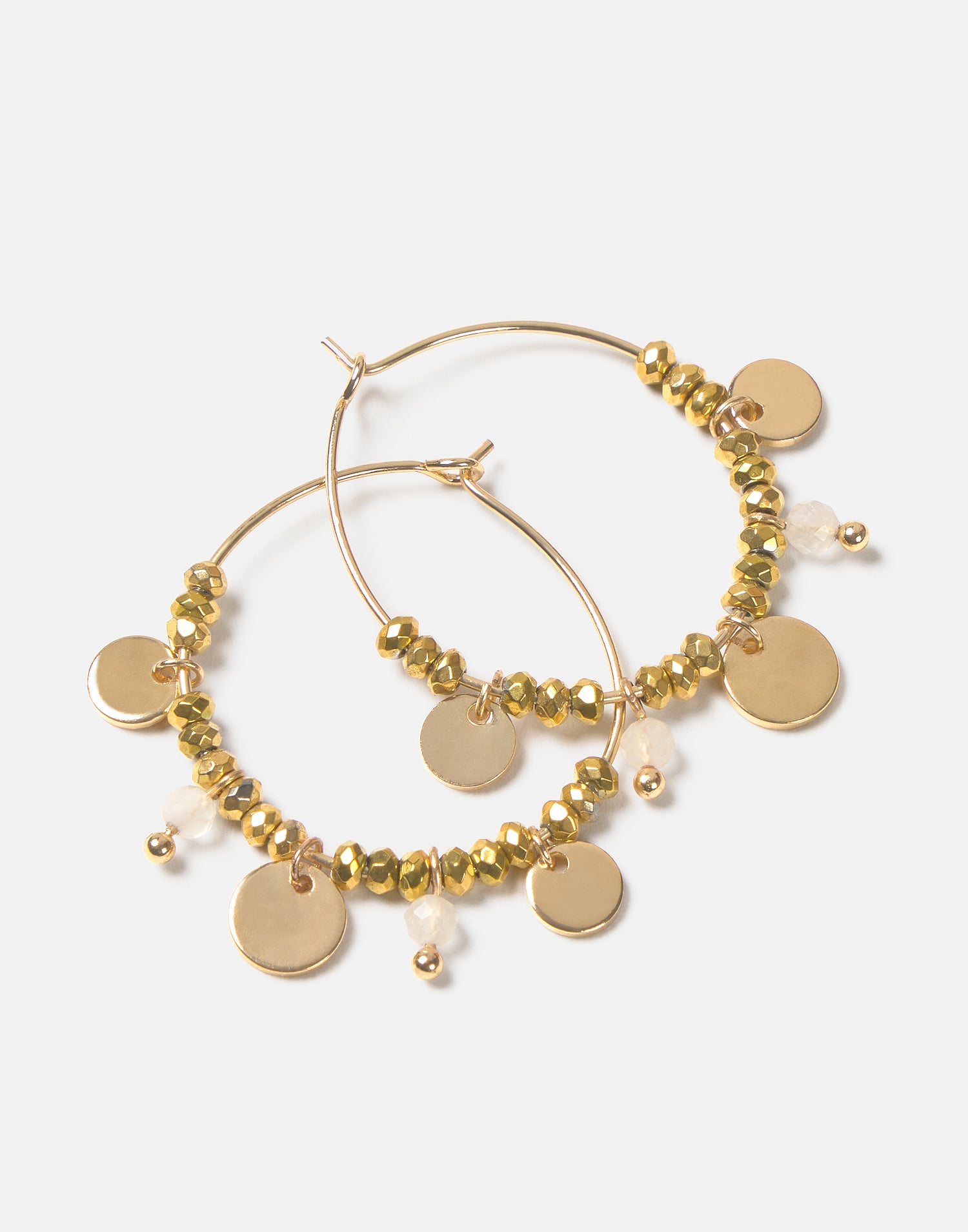 Aros dorados con cuentas doradas, piedras y medallas colgantes.