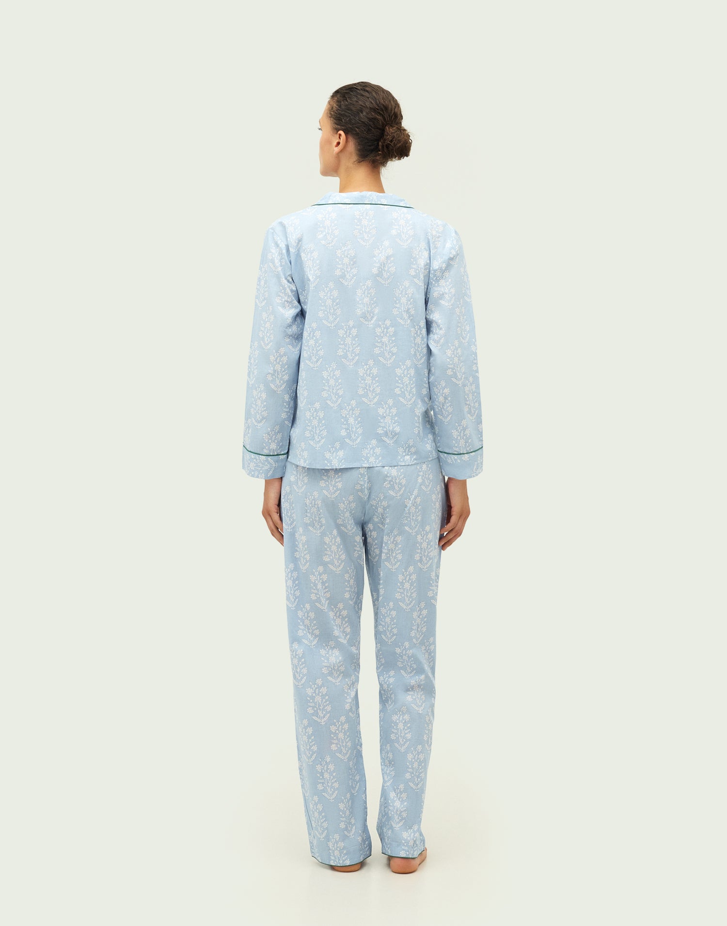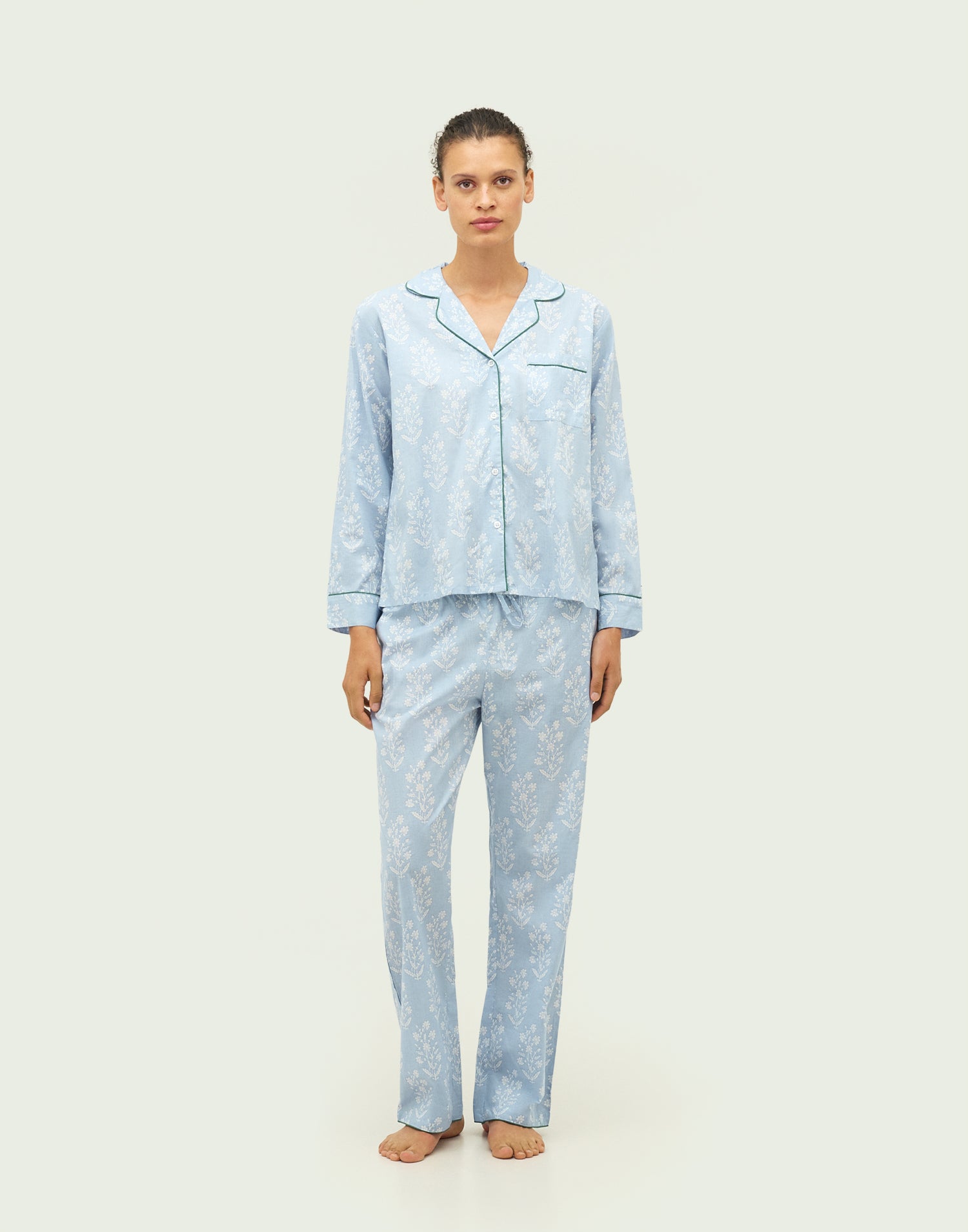Set de pijama en algodón compuesto por dos piezas: camisa de manga larga y pantalón largo. Acabado con ribete a contraste.